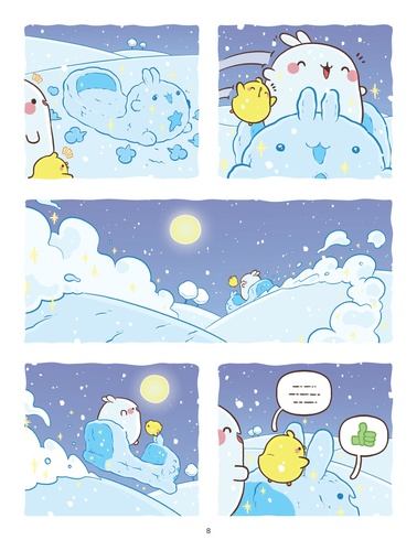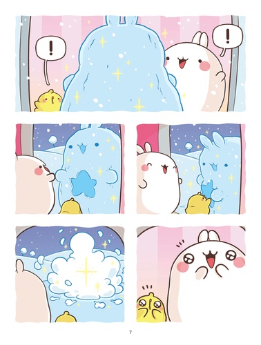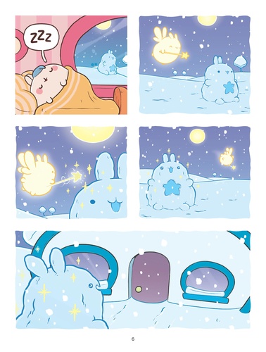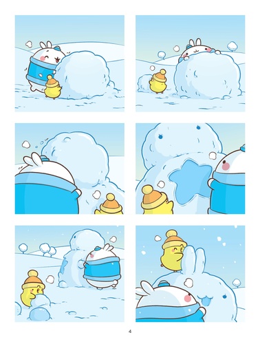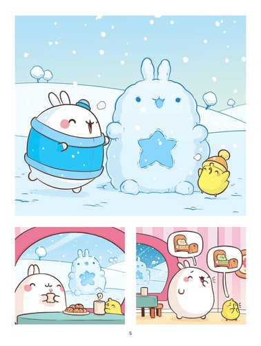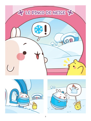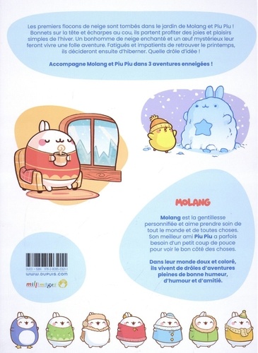 Les premiers flocons de neige sont tombés dans le jardin de Molang et Piu Piu ! Bonnets sur la tête et écharpes au cou, ils partent profiter des joies et plaisirs simples de l'hiver. Un bonhomme de neige enchanté et un oeuf mystérieux leur feront vivre une folle aventure. Fatigués et impatients de retrouver le printemps, ils décideront ensuite d'hiberner. Quelle drôle d'idée I Accompagne Molang et Plu Piu dans 3 aventures enneigées ! Molang est la gentillesse personnifiée et aime prendre soin de tout le monde et de toutes choses. Son meilleur ami Piu Piu a parfois besoin d'un petit coup de pouce pour voir le bon côté des choses. Dans leur monde doux et coloré, ils vivent de drôles d'aventures pleines de bonne humeur, d'humour et d'amitié.