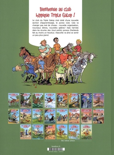 Attention, nouveaux arrivants : les poneys débarquent au club ! Le club du Triple Galop s'est doté d'une nouvelle section d'apprentissage : le poney club pour les bambins de 3/4 ans. Monique va enseigner à ses apprentis cavaliers les bases de l'équitation. Contact, respect de l'animal et activités ludiques sont au programme. Du côté des chevaux, cela va changer pas mal de choses : nouvelle organisation, nouveaux élèves, nouvelles galères ! Mais l'arrivée dans les écuries des (tout petits) poneys Shetlands fait au moins un heureux : Mascotte. Il va ainsi se sentir un peu plus grand.