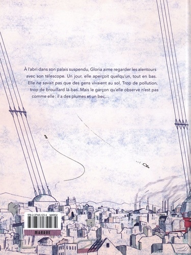 A l'abri dans son palais suspendu, Gloria aime regarder les alentours avec son télescope. Un jour, elle aperçoit quelqu'un, tout en bas. Elle ne savait pas que des gens vivaient au sol. Trop de pollution, trop de brouillard là-bas. Mais le garçon qu'elle observe n'est pas comme elle : il a des plumes et un bec...