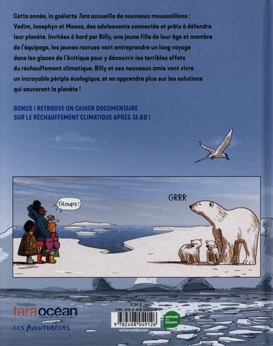 "SOS banquise", une bande dessinée de la collection "Les Aventureurs", à partir de 8 ans ! Billy, neuf ans, connaît bien la mer et les problématiques liées au réchauffement climatique : sa maman est capitaine de la goélette "Tara", un petit bateau qui lui sert à étudier les évolutions de la banquise et la fonte des glaces. Mais leur travail manque d'audience, et la situation empire année après année. Il est temps de faire bouger les consciences ! Et pour ça, rien de mieux que d'inviter des jeunes connectés pour venir les assister. C'est comme ça qu'embarquent le Sibérien Vadim, l'Ougandaise Josephyn et Moosa, venu des Maldives, trois adolescents qui vont suivre Billy et l'équipe, et communiquer auprès de leurs communautés. Aux côtés des scientifiques, ils vont découvrir les effets concrets de la pollution et les solutions à mettre en place pour la freiner, mais aussi rencontrer des populations autochtones et même se retrouver nez à nez avec un ours polaire : une vraie aventure écologique ! Un album consacré à une thématique tristement d'actualité et au centre des préoccupations des jeunes lecteurs, mais traitée ici avec nuance, réalisme et optimisme. Sous la plume de la scénariste Lucie Le Moine et le trait précis et poétique de Sylvain Dorange, les enfants et les scientifiques choisissent d'agir main dans la main, pour un monde meilleur demain ! Ce tome est relu et soutenu par la fondation Tara Océan, qui organise des expéditions pour comprendre et analyser l'impact du réchauffement climatique. "Un docu-BD d'actualité, réaliste et optimiste". Curionautes des sciences