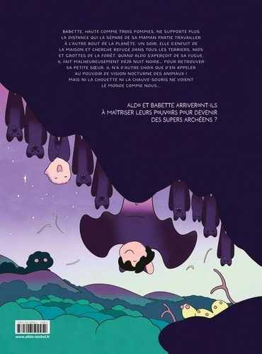 Babette, haute comme trois pommes, ne supporte plus la distance qui la sépare de sa maman partie travailler à l'autre bout de la planète. Un soir, elle s'enfuit de la maison et cherche refuge dans tous les terriers, nids et grottes et la forêt. Quand Aldo s'aperçoit de sa fugue, il fait malheureusement déjà nuit noire... Pour retrouver sa petite soeur, il n'a d'autre choix que d'en appeler au pouvoir de la vision nocturne des animaux ! Mais ni la chouette ni la chauve-souris ne voient le monde comme nous... Aldo et Babette arriveront-ils à maîtriser leurs pouvoirs pour devenir des supers archéens ?