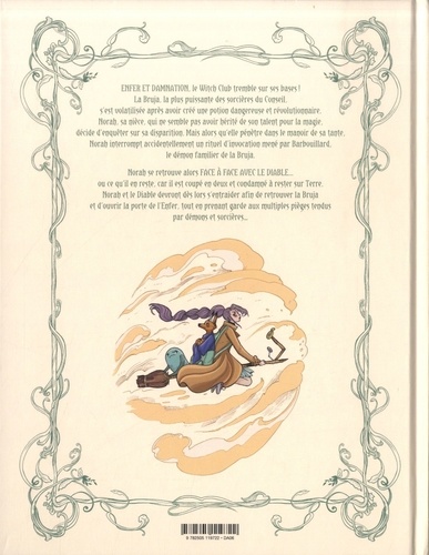 Le Witch Club tremble sur ses bases ! La Bruja, la doyenne et la plus puissante des sorcières du Conseil, veut lancer, contre l'avis de ses soeurs, "un sort révolutionnaire qui fera entrer la magie dans une autre ère" ! Mais alors qu'elle est sur le point d'accomplir ce nouveau sort, elle disparaît dans d'étranges circonstances. Pour ne rien arranger, Barbouillard, son démon domestique laissé sans supervision, invoque accidentellement le Diable en personne ! Au même moment, sa nièce Norah, une "sans-magie" , s'inquiète d'être sans nouvelles de sa tante et décide de se rendre chez elle. Alors qu'elle entre dans le manoir de La Bruja, elle interrompt l'invocation diabolique. Catastrophe : voilà le Diable coupé en deux et condamné à rester sur Terre ! Pour retrouver sa tante, Norah, obligée de trimballer Lucifer sur son dos, se lance dans une enquête qui la mènera aux quatre coins du monde, jusqu'à la porte de l'Enfer... sans se douter que sa vie et son destin de sorcière sont en jeu ! Sororité, fantasy et humour au menu de ce "Witch Club" qui ravira les jeunes amateurs et amatrices du genre ! Sandra Cardona au dessin, et Cédric Mayen au scénario, s'en donnent à coeur joie dans ce récit d'initiation magique et déploient un univers imaginaire où les sorcières sont reines. Bienvenue dans le Witch Club !