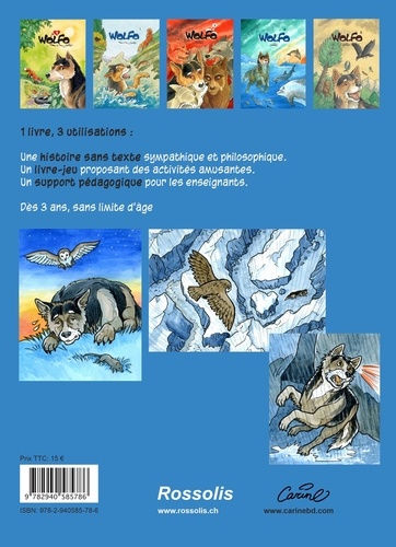 Vivez la nature par le mode de communication des animaux : sans parole ! Développez votre sens de l'observation et votre imagination. Cette fois, Wolfo affronte toutes sortes de péripéties liées à la vie pleine d'imprévus et d'une réalité difficile qu'affronte la famille de paysans de montagne chez qui Wolfo habite. Il va aussi être confronté à la montagne la nuit et faire connaissance de la Chouette des Clochers. Se lit dans toutes les langues. Apprendre, raconter, observer, jouer... Un album aux multiples applications !