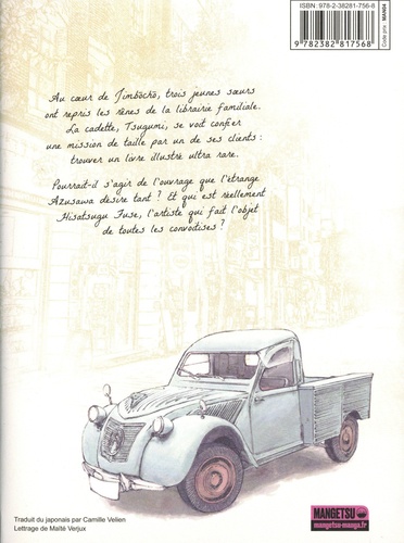 Au coeur de Jimbocho, trois jeunes soeurs ont repris les rênes de la librairie familiale. La cadette, Tsugumi, se voit confier une mission de taille par un de ses clients : trouver un livre illustré ultra rare. Pourrait-il s'agir de l'ouvrage que l'étrange Azusawa désire tant ? Et qui est réellement Hisatsugu Fuse, l'artiste qui fait l'objet de toutes les convoitises ? Après Sing Yesterday For Me et Les Mystères de Taishô, Kei Toume revient avec Jimbôchô Sisters, une comédie aux personnages féminins haut en couleurs dans le célèbre quartier japonais de Jimbôchô.