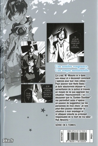 Ca y est, M. Misumi m'a dans son viseur et a découvert comment j'opérais pour tuer mes cibles. Pour pouvoir tuer Naito Baba, je dois absolument déjouer la surveillance de la police et trouver un moyen de ne pas aggraver ma situation. Heureusement, j'ai découvert que le "Golden Slumber" me permettait aussi d'opérer un pouvoir de suggestion sur les personnes de mon choix. Je vais peut-être pouvoir retourner la situation à mon avantage et m'attaquer ensuite au principal responsable de la mort de ma soeur : Ryû Akiyama ! SERIE EN 4 TOMES