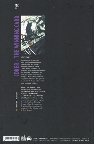 Batman, Année Un. Alors que Bruce Wayne est encore en phase d'apprentissage pour Incarner pleinement son rôle de justicier, Gordon se lance sur la trace d'un mystérieux clown psychopathe en pleine folie meurtrière. Ses intention sont floues, ses mobiles inexistants et, alors que Gotham est plongée dans la peur, Gordon et Batman sont apprendre es ROI en coûte de sous-estimer celui qui se fait appeler "Joker". JOKER - THE WINNING CARO, le récit du Joker le plus terrifiant depuis KILLING JOKE. Après l'excellent BATMAN - ONE BAD DAY : LE SPHINX, le duo Tom KING/Mitch GERADS, primé aux Eisner Awards, se retrouve pour explorer les origines du criminel le plus emblématique de la pop culture. Un récit sombre flirtant avec l'horreur, explorant les penchants les plus vicieux et cruels du clown dément.