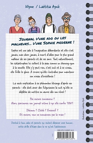 Sophie est une ado à l'imagination débordante et elle n'est jamais, mais alors jamais, à court d'idées pour le plus grand malheur de ses parents et de ses amis. Tout naturellement, les catastrophes lui collent à la peau comme un chewing-gum à la semelle. Elle n'y peut rien, c'est inné et à ce niveau, elle frôle le génie. A croire qu'elle s'entraîne pour maintenir son niveau d'excellence ! La seule explication à ce phénomène étrange d'après ses parents : elle doit avoir des fulgurances la nuit qu'elle se dépêche de mettre en oeuvre dès son réveil ! Pas encore convaincus ? Alors, parcourez son journal intime à qui elle confie TOUT. Décousu ? Cliché ? Excessif ? Et encore, vous ne connaissez pas la vraie ! Destiné à tous, ados et parents qui veulent dépasser avec humour, cette drôle d'étape dans la vie qu'est l'adolescence.