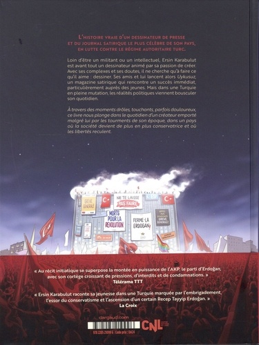 L'HISTOIRE VRAIE D'UN DESSINATEUR DE PRESSE ET DU JOURNAL SATIRIQUE LE PLUS CELEBRE DE SON PAYS, EN LUTTE CONTRE LE REGIME AUTORITAIRE TURC. Loin d'être un militant ou un intellectuel, Ersin Karabulut est avant tout un dessinateur animé par sa passion de créer. Avec ses complexes et ses doutes, il ne cherche qu'a faire ce qu'il aime : dessiner. Ses amis et lui lancent alors Uykusuz, un magazine satirique qui rencontre un succès immédiat, particulièrement auprès des jeunes. Mais dans une Turquie en pleine mutation, les réalités politiques viennent bousculer son quotidien. A travers des moments drôles, touchants, parfois douloureux, ce livre nous plonge dans le quotidien d'un créateur emporté malgré lui par les tourments de son époque, dans un pays où la société devient de plus en plus conservatrice et où les libertés reculent.