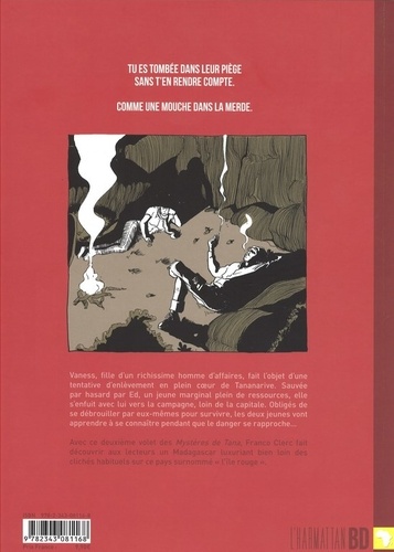 Vaness, fille d'un richissime homme d'affaires, fait l'objet d'une tentative d'enlèvement en plein coeur de Tananarive. Sauvée par hasard par Ed, un jeune marginal plein de ressources, elle s'enfuit avec lui vers la campagne, loin de la capitale. Obligés de se débrouiller par eux-mêmes pour survivre, les deux jeunes vont apprendre à se connaître pendant que le danger se rapproche... Avec ce deuxième volet des Mystères de Tana, Franco Clerc fait découvrir aux lecteurs un Madagascar luxuriant bien loin des clichés habituels sur ce pays surnommé "l'île rouge".