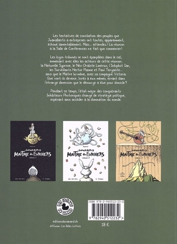 Quatrième volume de la série "Juanalberto maître de l'univers", cet album accompagne le parcours des personnages, chacun à son tour, après que les logos-tribunes les ont séparés. Ils sont maintenant dans la dimension magique que Junalberto a élue pour domicile : tout peut leur arriver... pour le meilleur ou pour le pire. Pendant que le maître cherche à comprendre la racine des problèmes survenus dans le monde qu'il a créé, en puisant dans ses théories cosmologiques, les Inhiphots se préparent pour une nouvelle politique de conquête du monde. De la fantaisie, de la philosophie, des personnages étranges, certains intimidants ou cruels, d'autres tendres ou lubriques. Pour un public amateur d'imaginaire.
