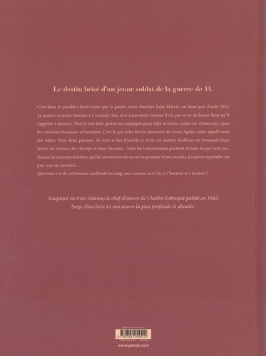 Le destin brisé d'un jeune poilu traumatisé par la guerre de 14-18 C'est dans la région paisible de la Haute-Loire que la guerre vient chercher Jules Matrat, un beau jour d'août 1914. La guerre, ce jeune homme n'y connait rien. Il n'a pas envie de la faire, comme il n'a pas envie de laisser Rose qu'il s'apprête à épouser. Mais il faut bien quitter la campagne pour se battre contre les Allemands, dans les tranchées boueuses et humides. C'est là que Jules fera la rencontre de Louis Agnin, autre jeune appelé venu des Alpes. Tous deux paysans, ils vont se lier d'amitié et rêver un instant d'ailleurs en évoquant leurs terres, les travaux des champs et leurs fiancées ... Quand Louis est abattu, et que la guerre prend fin, il est temps pour Jules, comme pour les milliers de mutilés, de regagner leur foyer. Rose est là, les parents de Jules aussi. Ils attendent leur fils pour recommencer à vivre. Mais que reste-t-il de l'homme qu'ils ont connu après quatre années meurtrières ? Jules ne parvient pas à oublier les canons et les cris, et encore moins à raconter l'horreur. Hanté par des souvenirs traumatiques, il s'isole. L'incompréhension de ses proches fera bientôt place aux reproches... Adapté du roman éponyme de Charles Exbrayat (publié aux éditions Albin Michel) ce premier tome d'une trilogie conçue comme "le récit de la vie quotidienne" raconte le destin brisé d'un jeune poilu hanté par les images d'une guerre qualifiée de "boucherie" . Cette oeuvre émouvante, soulève la douloureuse question des survivants, sans oublier les disparus, considérés comme les seuls héros de la guerre réellement morts pour leur patrie. A l'aube des nouveaux conflits armés en ce début de XXIe siècle, Serge Fino dépeint avec un réalisme déconcertant, la détresse d'un homme et les conséquences sur les générations futures de tels massacres, s'affirmant du même coup comme un auteur majeur du 9e art.