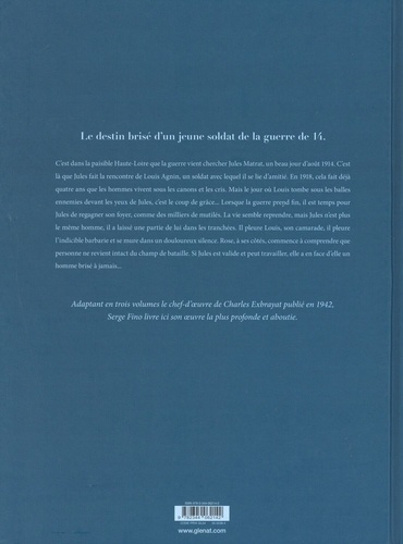 Le destin brisé d'un jeune poilu traumatisé par la guerre de 14-18. C'est dans la paisible Haute-Loire que la guerre vient chercher Jules Matrat, un beau jour d'août 1914. La guerre, il n'a pas envie de la faire, comme il n'a pas envie de laisser Rose, qu'il s'apprête à épouser. Mais il faut bien quitter la campagne pour combattre les Allemands dans les tranchées boueuses. C'est là que Jules fait la rencontre de Louis Agnin, un soldat avec lequel il se lie d'amitié. En 1918, cela fait déjà quatre ans que les hommes vivent sous les canons et les cris. Mais le jour où Louis tombe sous les balles ennemies devant les yeux de Jules, c'est le coup de grâce... Lorsque la guerre prend fin, il est temps pour Jules de regagner son foyer, comme des milliers de mutilés. La vie semble reprendre, mais Jules n'est plus le même homme, il a laissé une partie de lui dans les tranchées. Il pleure Louis, son camarade, il pleure l'indicible barbarie et se mure dans un douloureux silence. Rose, à ses côtés, commence à comprendre que personne ne revient intact du champ de bataille. Si Jules est valide et peut travailler, elle a en face d'elle un homme brisé à jamais... Adapté du roman éponyme de Charles Exbrayat (publié aux éditions Albin Michel), cette trilogie conçue comme "le récit d'une vie quotidienne" raconte le destin brisé d'un jeune poilu hanté par les images d'une guerre qualifiée de "boucherie" . Serge Fino dépeint avec un réalisme déconcertant la détresse d'un homme et les conséquences sur les générations futures de tels massacres, s'affirmant du même coup comme un auteur majeur du 9e art.