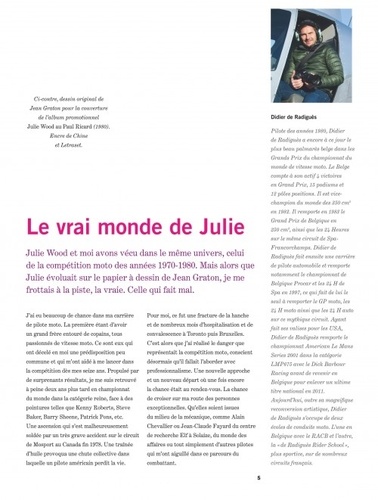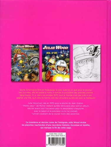 Jeune Américaine libre et fougueuse, la jolie Julie ne vit que pour la course ! Ses journées, elle les passe à moto, à remuer la poussière des grandes plaines désertiques. Et si, dans ces années 1970, tout le monde n'est pas prêt à voir gagner une fille, qu'à cela ne tienne, elle leur prouvera qu'elle est bien la meilleure ! Julie Wood est née en 1976 sous la plume de Jean Graton. "Petite soeur" de Michel Vaillant qu'elle retrouvera plus tard en album, elle est avant tout l'occasion pour le dessinateur d'explorer, avec le talent et la précision qu'on lui connaît, l'univers exaltant de la course moto des seventies. Ce troisième et dernier tome de l'intégrale Julie Wood révèle les planches inachevées d'une neuvième histoire, inconnue et inédite, qui marque la fin de cette saga.
