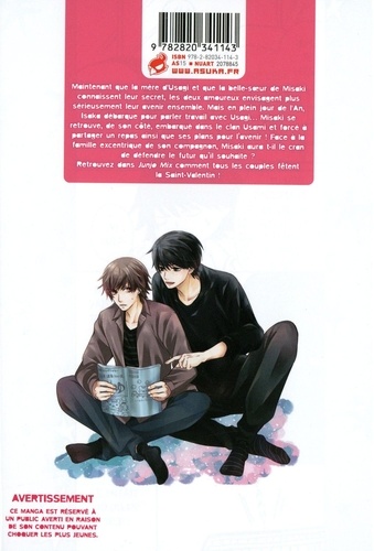 Maintenant que la mère d'Usagi et que la belle-soeur de Misaki connaissent leur secret, les deux amoureux envisagent plus sérieusement leur avenir ensemble. Mais en plein jour de l'An, Isaka débarque pour parler travail avec Usagi... Misaki se retrouve, de son côté, embarqué dans le clan Usami et forcé à partager un repas ainsi que ses plans pour l'avenir ! Face à la famille excentrique de son compagnon, Misaki aura t-il le cran de défendre le futur qu'il souhaite ? Retrouvez dans Junjo Mix comment tous les couples fêtent le Saint-Valentin !
