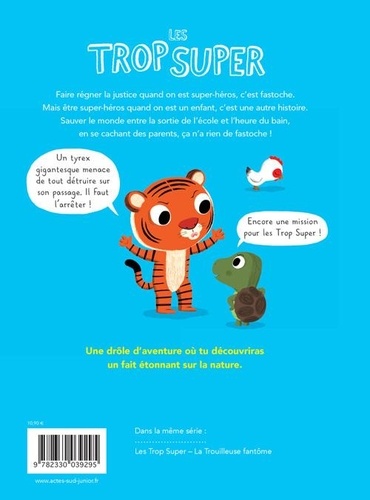 Une nouvelle série de petits albums en bande dessinée, mêlant aventure, humour et sensibilité à l'environnement. Super Tigre et Tortue Flash sont des super-héros mais aussi de vrais enfants qui ont l'âge de leurs lecteurs. Faire régner l'ordre et la justice, c'est après l'école ! Dans cette première mission, les Trop Super affrontent une poule monstrueuse dotée de dents énormes. Où l'on apprend que ces gallinacés sont bien des descendants des dinosaures.