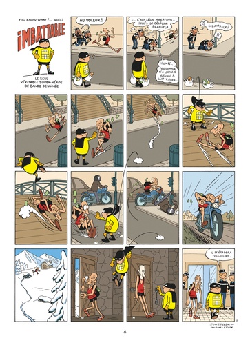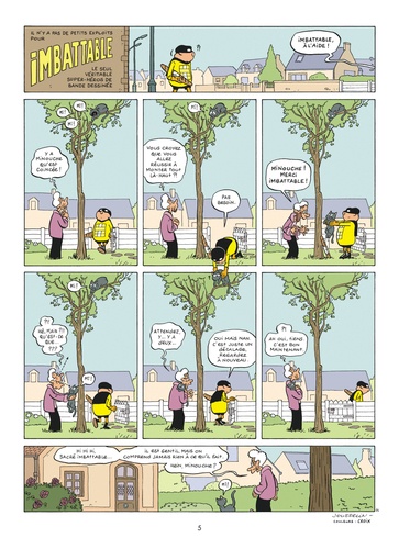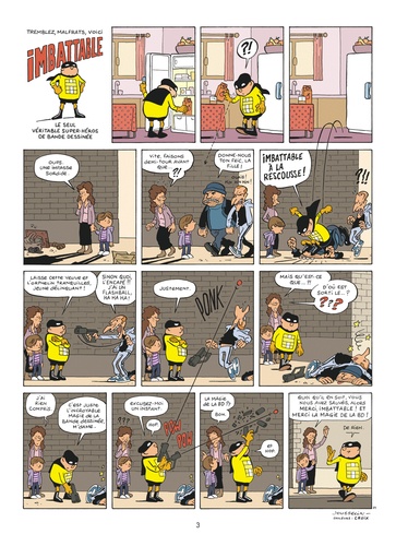 Tremblez, malfrats, voici Imbattable ! Ce nouveau protagoniste porte secours à la veuve et à l'orphelin comme tout héros qui se respecte, mais il sauve aussi les chiens, les chats des grands-mères, les terrains de pétanque, le fils du maire, et la ville tout entière. Masqué, comme tout justicier, capé, comme tout justicier, il mène la vie dure aux savants fous et aux mauvais plaisantins, sans jamais oublier de ramener le pain. Non seulement Imbattable est imbattable, mais son super-pouvoir fait de lui le seul véritable super-héros de bande dessinée ! De la structure quadrillée des planches de BD, Pascal Jousselin a fait un champ d'exploration narrative, un espace ludique où déplacer ses personnages en toute liberté. Son super-héros bondit d'une case à l'autre et joue des décalages et des transferts, Imbattable est non seulement un véritable hommage à la BD classique franco-belge, mais aussi une formidable expérience de lecture, dynamique et inventive.