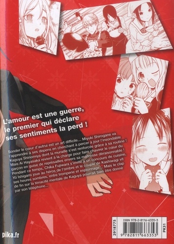 Sonder le coeur d'autrui est un art difficile... Miyuki Shirogane va l'apprendre à ses dépens en cherchant à percer à jour l'insondable Kaguya Shinomiya dont la muraille s'est renforcée grâce à sa routine ! Mais Ai Hayasaka revient à la charge pour faire chavirer le coeur du garçon en guise de représailles envers sa maîtresse déraisonnable ! Pendant ce temps, Chika Fujiwara s'invite à un concours de cuisine, Yû Ishigami joue au héros de l'ombre et le couple de Kashiwagi vit ses heures sombres, entre tromperie et espionnage... Mais le clap de fin sur la ténacité mentale de Kaguya pourrait bien être donné par son téléphone...