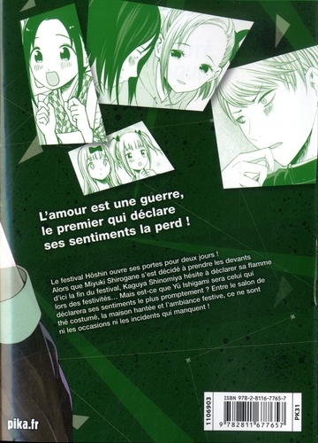 Le festival Hôshin ouvre ses portes pour deux jours ! Alors que Miyuki Shirogane s'est décidé à prendre les devants d'ici la fin du festival, Kaguya Shinomiya hésite à déclarer sa flamme lors des festivités... Mais est-ce que Yû Ishigami sera celui qui déclarera ses sentiments le plus promptement ? Entre le salon de thé costumé, la maison hantée et l'ambiance festive, ce ne sont ni les occasions ni les incidents qui manquent !