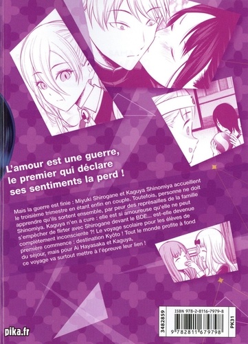 Mais la guerre est finie : Miyuki Shirogane et Kaguya Shinomiya accueillent le troisième trimestre en étant enfin en couple. Toutefois, personne ne doit apprendre qu'ils sortent ensemble, par peur des représailles de la famille Shinomiya. Kaguya n'en a cure : elle est si amoureuse qu'elle ne peut s'empêcher de flirter avec Shirogane devant le BDE... est-elle devenue complètement inconsciente ? ! Le voyage scolaire pour les élèves de première commence : destination Kyôto ! Tout le monde profite à fond du séjour, mais pour Ai Hayasaka et Kaguya, ce voyage va surtout mettre à l'épreuve leur lien !