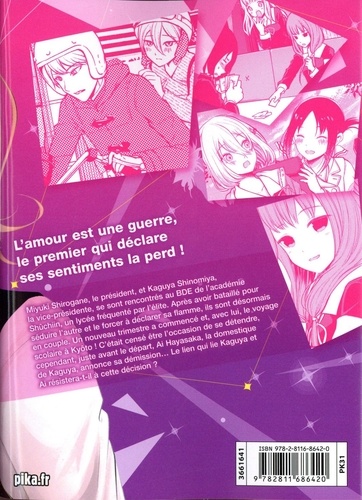 Miyuki Shirogane, le président, et Kaguya Shinomiya, la vice-présidente, se sont rencontrés au BDE de l'académie Shûchiin, un lycée fréquenté par l'élite. Après avoir bataillé pour séduire l'autre et le forcer à déclarer sa flamme, ils sont désormais en couple. Un nouveau trimestre a commencé et, avec lui, le voyage scolaire à Kyôto ! C'était censé être l'occasion de se détendre, cependant, juste avant le départ, Ai Hayasaka, la domestique de Kaguya, annonce sa démission... Le lien qui lie Kaguya et Ai résistera-t-il à cette décision ?
