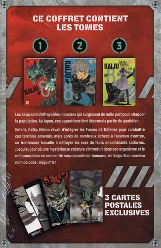 Les kaiju sont d'effroyables monstres qui surgissent de nulle part pour attaquer la population. Au Japon, ces apparitions font désormais partie du quotidien... Enfant, Hibino Kafka rêvait d'intégrer les Forces de Défense pour combattre ces terribles ennemis, mais après de nombreux échecs à l'examen d'entrée, ce trentenaire travaille à nettoyer les rues de leurs encombrants cadavres. Jusqu'au jour où une mystérieuse créature s'introduit dans son organisme et le métamorphose en une entité surpuissante mi-humaine, mi-kaiju. Son nouveau nom de code : Kaiju n° 8 !