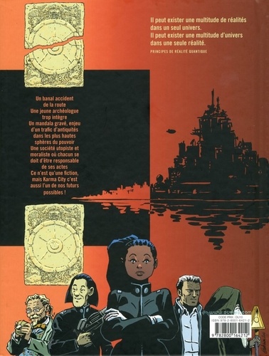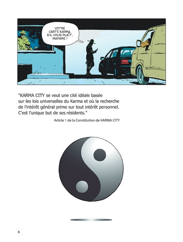 Karma City : une ville vertueuse régie par les lois universelles du karma, où l'intérêt général primerait toujours sur l'intérêt particulier. Dans une société dirigée par le concept de karma, Emma List se présente aux portes de la "zone blanche" de la capitale. Autorisée à entrer malgré un karma un peu négatif, elle fait un AVC quelques minutes plus tard et s'écrase avec son véhicule. Ce qui ne semblait être qu'un rapport de routine pour les agents Cooper, Napoli et Asuki va pourtant se transformer en enquête de vaste envergure. Car Emma, chercheuse en paléontologie, s'était installée en zone grise à la recherche d'un mandala gravé, témoignage de l'existence de sociétés pré-karmiques. Or fouiller ces dangereux sables mouvants exploités par les industriels n'est pas sans danger... La brigade finit par retrouver un corps dans la zone, le shérif local a pris la fuite, et même leur supérieur semble impliqué... Cette société qui érige le bien et l'intérêt général comme règle de vie a peut-être atteint ses limites… Une nouvelle série tout à la fois policière et futuriste, au scénario plein de suspense !