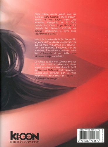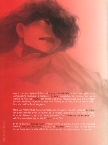 Découvrez un conte cruel et vénéneux, dans lequel la puissance évocatrice du trait de Daruma Matsuura fait merveille ! Alors que les représentations d'Une goutte d'étoile battent leur plein, une comédienne manque à l'appel... Kasane, incapable de monter sur scène depuis la fuite de Nogiku, est portée disparue. Pendant que tous s'interrogent sur son absence, la jeune actrice erre le long de la mer, avec la ferme intention de mettre fin à ses jours. Mais, au moment de passer à l'acte, une image lui revient : celle de sa mère, qui s'est sacrifiée pour la sauver de la noyade quand elle était petite. L'occasion de découvrir, pour la toute première fois, l'enfance de Kasane et la relation complexe qui unissait Izana à sa fille... Et si la grande Sukeyo Fuchi prenait enfin la parole ? Dans cette nouvelle inédite, Daruma Matsuura, l'auteur de Kasane, lève le voile sur les secrets d'une âme tourmentée, déchirée entre amour et rejet, laideur et beauté.