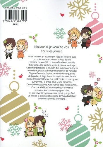 Moi aussi, je veux te voir tous les jours ! Nous sommes en automne et Kase est toujours aussi occupée avec son club et sa vie au dortoir. Yamada, de son côte continue d'étudier et travaille à mi-temps. Elle a même rejoint le club de jardinage. Ce dernier participe à la création d'un jardin pour la fête de l'université, produit par un jardinier admire de Yamada : Tagame Densuke. De plus, un invité de marque sera de la partie... Il s'agit d'un acteur qui intervient dans la même émission télévisée que M. Densuke, un beau gosse surnommé "le prince fleuri", Seki Tomoharu. Quand elle le découvre, Kase n'arrive pas à rester calme... Chacune a la fête d'automne de son université, puis vient leur premier voyage en hiver. Et leur envie de vivre ensemble ne fait que gonfler ! Le récit de la jeunesse étincelante de Yamada et Kase, troisième volume à l'université !