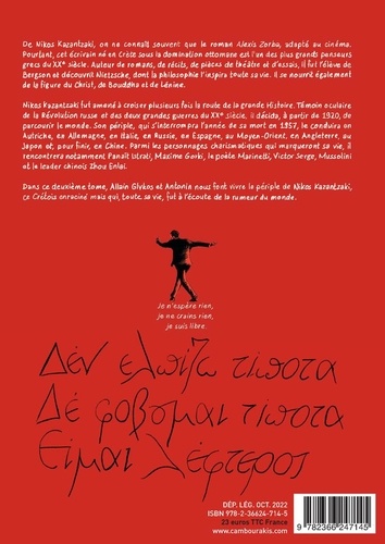De Nikos Kazantaaki, on ne connaît souvent que le roman Alexis Zorba, adapté au cinéma. Pourtant, cet écrivain né en Crète sous la domination ottomane est l'un des plus grands penseurs grecs du XXe siècle. Auteur de romans, de récits, de pièces de Théâtre et d'essais, il fut relève de Bergson et découvrit Nietzsche, dont la philosophie l'inspira toute sa vie. Il se nourrit également de la figure du Christ, de Bouddha et de Lénine. Nikos kazantzaki fut amené à croiser plusieurs fois la route de la grande Histoire. Témoin oculaire de la Révolution russe et des deux grandes guerres du XXe siècle, il décida, à partir de 1910, de parcourir le monde. Son périple, qui s'interrompra l'année de sa mort en 1357, le conduira en Autriche, en Allemagne, en Italie, en Russie, en Espagne, au Moyen-Orient, en Angleterre, au Japon et, pour finir, en Chine. Parmi les personnages charismatiques qui marqueront sa vie, il rencontrera notamment Panaït Istrati, Maxime Gorki, le poète Marinetti, Victor Serge, Mussolini et le leader chinois Zhou Enlai. Dans ce deuxième tome, Allain Glykos et Antonin nous font vivre le périple de Nikos Kazantzaki, ce Crétois enraciné mais qui, toute sa vie, fut à l'écoute de la rumeur du monde.