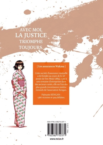 Les assurances Wakasa Cette société d'assurance mutuelle a été fondée au cours de la 22e année de l'ère Meiji (1889). Liée à une centaine d'entreprises dans des secteurs variés, elle est l'un des plus grands investisseurs institutionnels de l'association Kengan. Palmarès KENGAN : 1366 victoires et 909 défaites. AVEC MOI, LA JUSTICE TRIOMPHE TOUJOURS.