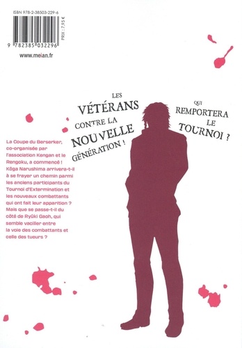 La Coupe du Berserker, co-organisée par l'association Kengan et le Rengoku, a commencé ! Kôga Narushima arrivera-t-il à se frayer un chemin parmi les anciens participants du Tournoi d'Extermination et les nouveaux combattants qui ont fait leur apparition ? Mais que se passe-t-il du côté de Ryûki Gaoh, qui semble vaciller entre la voie des combattants et celle des tueurs ?