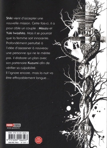 Shiki a accepté une nouvelle mission. Cette fois, sa cible est un couple : Misuzu et Yuki Iwashita. Bien que perturbé par la perspective d'assassiner une femme, il n'a pas d'autres choix que d'exécuter le contrat. Il a franchi la ligne rouge. A présent, il n'a plus rien d'humain et n'a plus d'hésitation à presser la détente. En se rendant au domicile des victimes, il ignore que la nuit va être longue. Ce contrat pourrait changer sa vie à jamais. Le cauchemar est loin d'être terminé... Yua Kotegawa est reconnue pour ses thématiques ô combien singulières et sombres. L'auteure de Détenu 042 et Anne Freaks propose ici une intrigue simple et redoutable qui rappelle la question posée dans Death Note : un meurtre est-il justifié si la victime est un criminel ? La mangaka édulcore la vision manichéenne de l'être humain selon laquelle les individus sont bons ou mauvais. Elle instaure la notion de gris, de demi-teinte en mettant en avant la jeunesse mise de côté par la société japonaise ou les victimes de l'immigration.
