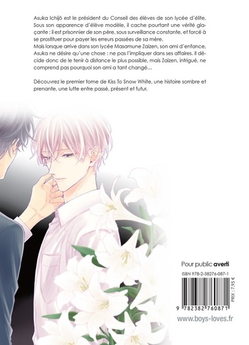 Asuka Ichijô est le président du Conseil des élèves de son lycée d'élite. Sous son apparence d'élève modèle, il cache pourtant une vérité glaçante : il est prisonnier de son père, sous surveillance constante, et forcé à se prostituer pour payer les erreurs passées de sa mère. Mais lorsqu'arrive dans son lycée Masamune Zaizen, son ami d'enfance, Asuka ne désire qu'une chose : ne pas l'impliquer dans ses affaires. Il décide donc de le tenir à distance le plus possible, mais Zaizen, intrigué, ne comprend pas pourquoi son ami a tant changé... Découvrez le premier tome de Kiss To Snow White, une histoire sombre et prenante, une lutte entre passé, présent et futur et de complications !