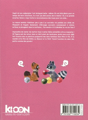 Hagiri et son coéquipier l'ont échappé belle : même s'ils ont été démis pour un temps de leurs fonctions, ils n'ont pas été exclus de la meute ! Et, à sa grande surprise, Senzo a reçu toute la reconnaissance des loups pour son aide... Le renard semble s'habituer peu à peu à sa nouvelle vie paisible aux côtés de Manpachi et Koyuki. Seulement, d'étranges souvenirs commencent à refaire surface, le plongeant dans la confusion... Parviendra-t-il à démêler le vrai du faux ? Impossible de rester de marbre face à cette fable animalière ultra-craquante ! Mi Tagawa est de retour dans un récit plein de tendresse, après nous avoir déjà fait fondre avec sa peinture poignante des liens familiaux dans Père & Fils. A la manière d'un film de Ghibli, Le Renard et le Petit Tanuki touchera le coeur des petits comme des grands !