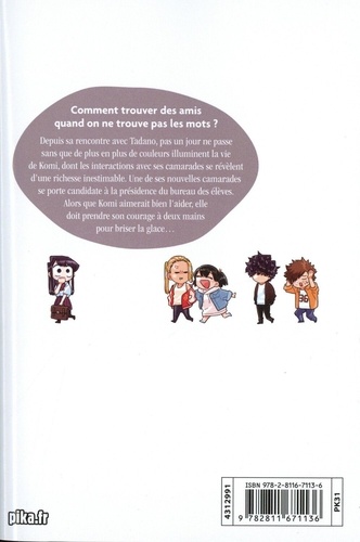 Comment trouver des amis quand on ne trouve pas les mots ? Depuis sa rencontre avec Tadano, pas un jour ne passe sans que de plus en plus de couleurs illuminent la vie de Komi, dont les interactions avec ses camarades se révèlent d'une richesse inestimable. Une de ses nouvelles camarades se porte candidate à la présidence du bureau des élèves. Alors que Komi aimerait bien l'aider, elle doit prendre son courage à deux mains pour briser la glace...