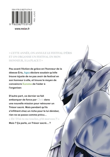 " Cette année, on annule le festival d'Eris et on organise un festival en mon honneur, à la place !! " Peu avant l'Action de grâce en l'honneur de la déesse Eris, Aqua déclare soudain qu'elle trouve injuste de ne pas avoir de festival en son honneur à elle, et trouve le moyen de convaincre Kazuma de l'aider à l'organiser. D'autre part, ce dernier se fait embarquer de force par Chris dans une nouvelle mission pour retrouver un Trésor sacré. Mais pendant qu'ils s'infiltrent chez un riche pour le lui dérober, rien ne se passe comme prévu... " Eh ! D'où tu me touches, p'tit morveux ? ! " Mais ? Ca parle, un Trésor sacré... ?