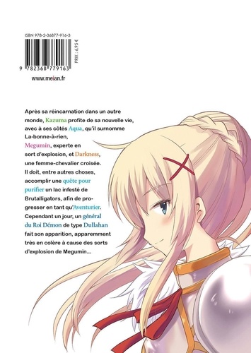 Après sa réincarnation dans un autre monde, Kazuma profite de sa nouvelle vie, avec à ses côtés Aqua, qu'il surnomme La-bonne-à-rien, Mégumin, experte en sort d'explosion, et Darkness, une femme-chevalier croisée. Il doit accomplir une quête pour purifier un lac infesté de Brutal-Alligator, entre choses afin de progresser en tant qu'Aventurier. Cependant un jour, un général du Maô de type Dullahan fait son apparition, apparemment très en colère à cause des sorts d'explosion de Mégumin...