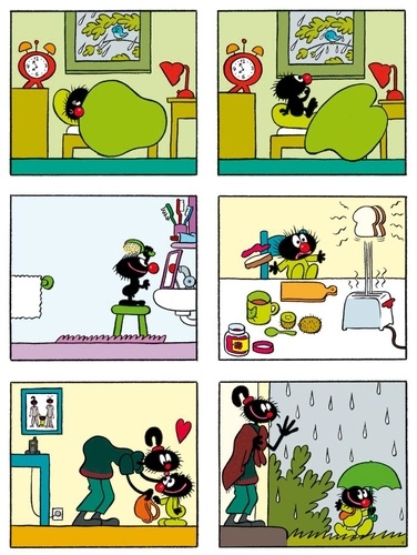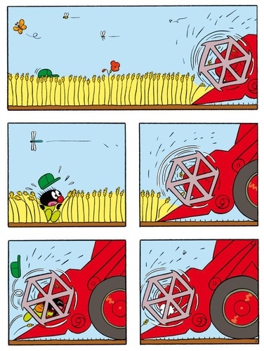 Il est petit, il est poilu, c'est Petit Poilu ! Le v'là parti de bon matin, le v'là parti et tout va bien. Mais ?... Que se passe-t-il ? Ça se bouscule Et tout bascule ! Des épis de blé doré, une machine gloutonne confectionneuse de ballots, un matou miteux toujours prêt pour les sales coups, un pauvre poussin et des poules en folie qui font péter le pop-corn... Vas-y Petit Poilu fonce !