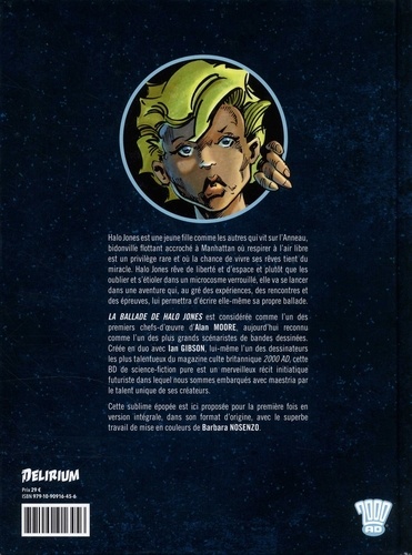 Halo Jones est une jeune fille du 50ème siècle comme toutes les autres, qui vit sur l'Anneau, ville fermée flottante accrochée à Manhattan, où rares sont ceux qui ont la chance de respirer à l'air libre. Coincée dans un quotidien claustrophobe où on n'échappe au chômage et à l'ennui que grâce aux divertissements industriels ou à l'oisiveté des paradis artificiels, Halo Jones rêve d'évasion, d'aventure et d'espace. Accompagnée de ses amis Rodice et Brinna ainsi que de leur chien robot Toby, elle va se lancer dans sa plus improbable aventure et s'embarquer dans une quête parsemée de doutes, de dangers, de découvertes, mais aussi de séparations, de pertes et de nouvelles rencontres. Au 50ème siècle, comme à toutes les époques, on a la chance d'écrire sa propre histoire, ce que va faire Halo Jones et ainsi composer son immortelle Ballade. LA BALLADE D'HALO JONES est considérée comme l'un des premiers chefs-d'oeuvre d'Alan MOORE, aujourd'hui reconnu comme l'un des plus grands scénaristes de BD et de comics depuis plus de trente ans. Créée en duo avec Ian GIBSON, lui-même l'un des dessinateurs les plus talentueux du magazine culte britannique 2000 AD, cette BD de science-fiction pure est une ballade merveilleuse dans un univers futuriste très lointain, où les préoccupations des humains nous semblent toujours aussi familères. Quête initiatique dans laquelle nous sommes embarqués avec maestria par le talent unique de ses créateurs, LA BALLADE D'HALO JONES est autant un incroyable voyage futuriste qu'une sublime épopée humaniste, présentée pour la première fois aux lecteurs français en intégralité dans son grand format d'origine et en couleurs.