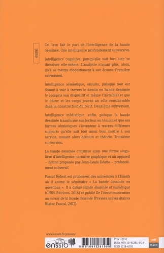 Ce livre fait le pari de l'intelligence de la bande dessinée. Une intelligence profondément subversive. Intelligence cognitive, puisqu'elle sait fort bien se théoriser elle-même. L'analyste n'ayant plus, alors, qu'à se mettre modestement à son écoute. Première subversion. Intelligence sémiotique, ensuite, puisque tout est donné à voir à travers le dessin en bande dessinée (y compris son dispositif et même l'invisible) et que le décor et les corps jouent un rôle considérable dans la construction du récit. Deuxième subversion. Intelligence médiatique, enfin, puisque la BD transforme son lecteur en témoin et que ses formes sémiotiques s'inventent à travers différents supports qu'elle sait tout aussi bien mettre à son service, nouant alors histoire et théorie. Troisième subversion. La bande dessinée constitue ainsi une forme singulière d'intelligence narrative graphique et un appareil, dans la conception de Jean-Louis Déotte, profondément subversif. Pascal Robert est professeur des universités à l'Enssib où il anime le séminaire "La bande dessinée en questions" . Il a dirigé Bande dessinée et numérique (CNRS Editions, 2016) et publié De l'incommunication au miroir de la bande dessinée (Presses universitaires Blaise Pascal, 2017), ainsi que de nombreux articles sur l'image et sur la théorie des technologies intellectuelles.