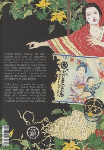 Lorsque Tokiko retrouue son mari, rapatrié après avoir été grièvement blessé au combat. il n est plus qu'un homme-tronc le lieutenant Sunaga a perdu bras et jambes et ses blessures l'ont rendu sourd-muet. Condamnée à vivre recluse avec lui. Tokiko va ressentir un plaisir nouveau, entre dégoôt et fascination. à voir souffrir cet être difforme et sans défense. Suehiro Maruo, le maiître de l'ero-guro nous plonge dans le Japon de l'ère Taishô (1912-1926) en adaptant une oeuvre du célèbre écrivain Edogawa Ranpo, père du roman policier japonais et auteur de nombreux ouvrages ou érotisme vient se mêler au grotesque.