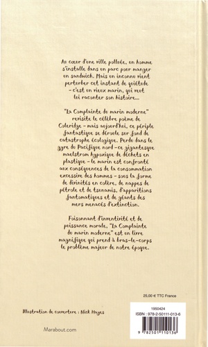Au coeur d'une ville polluée, un homme s'installe dans un parc pour manier un sandwich. Mais un inconnu vient perturber cet instant de quiétude - c'est un vieux marin, lui veut lui raconter son histoire... La Complainte u marin moderne" revisite le célèbre poème de Coleridge - mais aujourd'hui, ce périple fantastique se déroule sur fond de catastrophe écologique. Perdu dans le gyre du Pacifique nord -ce gigantesque maelstrom hypoxique de déchets en plastique - le marin est confronté aux conséquences de la consommation excessive des hommes - sous la forme de divinités en colère, de nappes de pétrole et de tsunamis, d'apparitions fantomatiques et de liants des mers menacés d'extinction. Foisonnant d'inventivité et de puissance morale, "La Complainte du marin moderne" est un livre magnifique qui prend à bras-le-corps le problème majeur de notre époque.