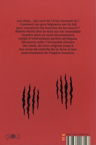 Dans cette bande dessinée documentaire extrêmement fouillée, le célèbre félinologue Alberto Montt nous fait découvrir un pan caché de l'histoire de l'humanité et révèle comment les chats sont apparus sur Terre pour en prendre progressivement le contrôle après avoir asservi l'espèce humaine. Grâce à des recherches approfondies, à l'accès à des documents rares et confidentiels, mais aussi à de nombreuses enquêtes sur le terrain, Alberto Montt retrace dans le détail la formidable histoire des maîtres du monde. Il explique comment les chats, créés à l'image de Dieu, se sont longuement concertés pour déterminer les meilleurs moyens de prendre le contrôle de la Terre sans se mettre à dos la population humaine, et même mieux, en faisant en sorte que cette conquête se fasse avec leur assentiment. Notez que ce court précis historique est le compagnon indispensable du précédent ouvrage de cet auteur ; J'adore mon chat (mais il s'en fout complètement).