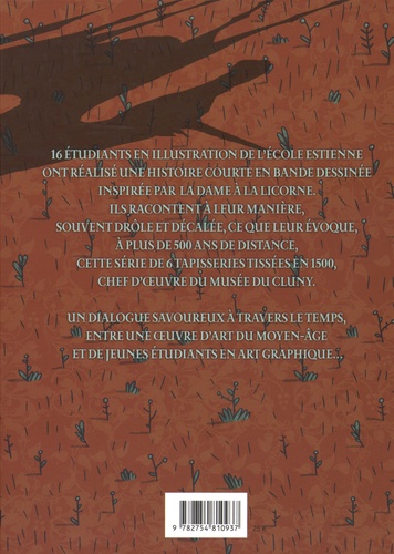 16 étudiants en illustration de l'Ecole Estienne ont réalisé une histoire courte en bande dessinée inspirée par la Dame à la licorne. Ils racontent à leur manière, souvent drôle et décalée, ce que leur évoque, à plus de 500 ans de distance, cette série de 6 tapisseries tissées en 1500, chef-d'oeuvre du musée de Cluny. Un dialogue savoureux à travers le temps, entre une oeuvre d'art du Moyen Age et de jeunes étudiants en art graphique...