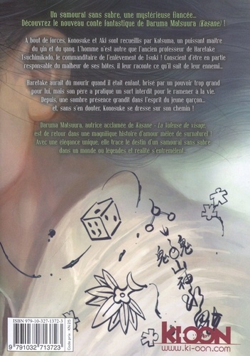 Un samourai ? sans sabre, une mystérieuse fiancée... Découvrez le nouveau conte fantastique de Daruma Matsuura (Kasane) ! Konosuke découvre qu'il est la cible de la famille Tsuchimikado, qui commande aux maîtres du yin et du yang de tout le pays. Après avoir fui devant une bande hétéroclite de détenteurs de pouvoirs, le voilà face à un adversaire plus coriace : Madara, une jeune femme qui contrôle les insectes. La rage donne au samourai ? la force de maîtriser son don et le soutien d'Aki, la prêtresse aveugle, lui permet de vaincre cette nouvelle ennemie, mais le combat laisse les deux compagnons bien mal en point. Heureusement, des alliés inattendus leur portent secours... Daruma Matsuura, autrice acclamée de Kasane - La Voleuse de visage, est de retour dans une magnifique histoire d'amour pimentée de fantasy ! Avec une élégance unique, elle trace le destin d'un samourai ? sans sabre dans un monde où légendes et réalité s'entremêlent...