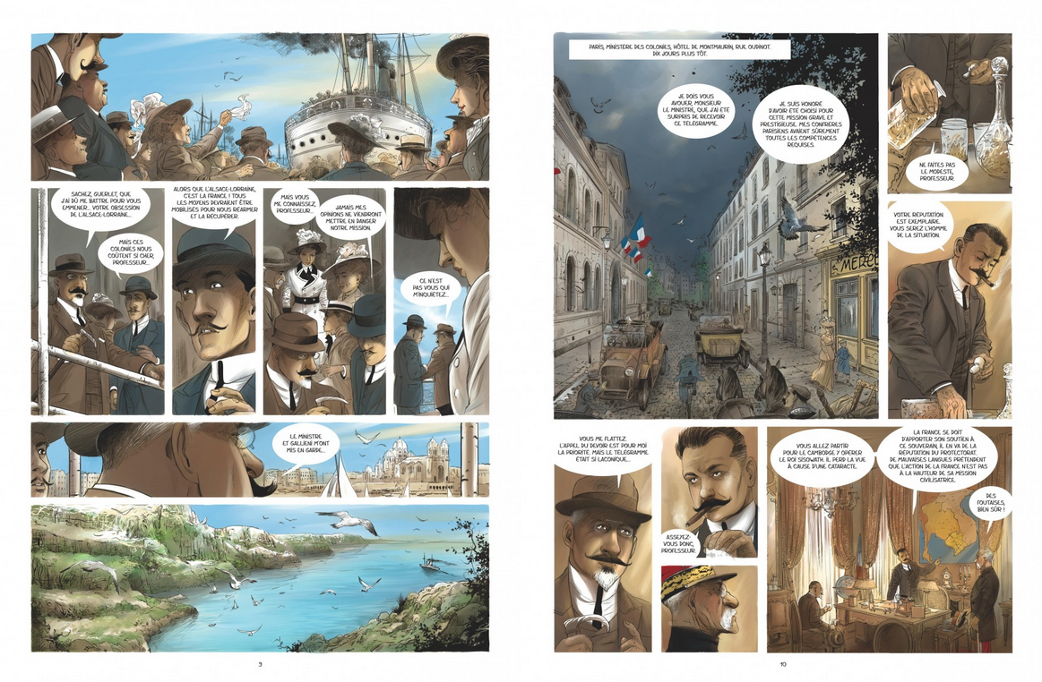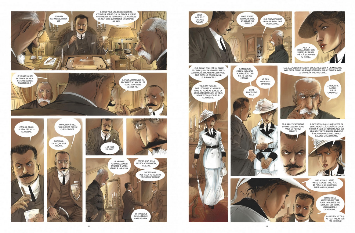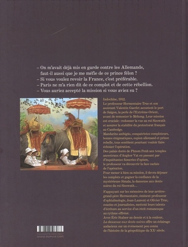 France, 1912. Le gouvernement confie au professeur Hermentaire Truc une mission cruciale : opérer le roi Sisowath pour lui rendre la vue et garantir la stabilité du protectorat français sur le Cambodge. Accompagné de son assistant Guerlet, Truc embarque pour Saigon. A leur arrivée, les deux hommes vont de surprises en déconvenues. Ministres comploteurs, bonzes politisés, prince rebelle... Chacun semble vouloir faire échouer l'opération. Truc découvre alors la réalité cachée derrière la propagande du protectorat français et les enjeux géopolitiques de l'opération. Pour mener à bien sa mission, le docteur Truc va devoir déjouer des complots et chercher la confiance de l'intrigante Simala, la danseuse aux dents noires du roi Sisowath... Un récit fort basé sur les mémoires d'Hermentaire Truc, professeur d'ophtalmologie français. La danseuse aux dents noires marque le grand retour d'Eric Stalner au sein du label Aire Libre. Sur un scénario épique inspiré de la vie de l'aïeul de Jean-Laurent et Olivier Truc.