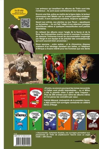 Les animaux qui émaillent les albums de Tintin sont très nombreux ; ils sont aussi extrêmement bien dessinés. Encore une fois, grâce au maitre de la ligne claire, le lecteur remarquera des détails qui lui avaient peut-être échappé. Là aussi, il aura quelques surprises, toujours agréables... Quant aux arbres, aux plantes ou aux fleurs - aquatiques ou terrestres -, ils ont fait l'objet d'une attention presque pointilleuse même si quelques inexactitudes sont parfois décelables. En relisant les albums sous l'angle de la faune et de la flore, les tintinophiles avertis auront à nouveau l'occasion de mesurer l'immense travail de documentation engrangé par Hergé et son équipe et de préciser des connaissances qui sont souvent bien anciennes ! Nous saurons - entre autres - si le rhinocéros dispose vraiment d'un blindage résistant aux balles, si l'éléphant d'Afrique a d'autre intérêt pour les hommes que ses dents d'ivoire, ou encore pourquoi les lamas rencontrés à Callao sont plutôt improbables... ou si Milou a été le premier chien à partir dans l'espace... Plus de 200 entrées pour relire les albums même si l'on pense les connaitre par coeur.