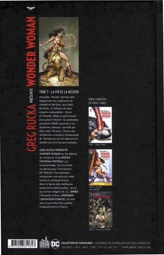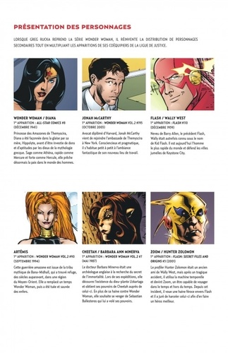 Aveuglée, Wonder Woman doit réapprendre les rudiments du combat et fait face, aux côtés de Flash, à l'alliance de deux ennemis redoutables : Zoom et Cheetah. Mais un péril encore plus grand l'attend : les androïdes assassins OMAC associés à un Superman dément, contrôlé par Max Lord ! De plus, l'heure des révélations a sonné à l'ambassade de Themyscira où l'on découvre le double-jeu d'un de ses employés. Greg Rucka présente Wonder Woman ou les débuts du romancier Greg Rucka (Gotham Central) sur le personnage, dix ans avant sa reprise pour l'événement DC Rebirth ! Ces épisodes composent une série qui mêle action et politique fiction, dans la lignée des meilleures productions télévisuelles, servie par le trait élégant de J.G. Jones (Wanted) et Drew Johnson (Sensation Comics), et sont pour la première fois publiés intégralement en France.