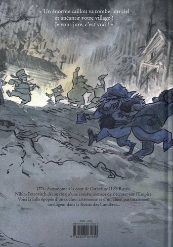 1774. Eminent astronome oeuvrant sous le règne de l'impératrice Catherine II de Russie, Nikita Petrovitch est un cochon irascible et peu amène. Contraint de prendre sous son aile Ivan, un chien fou aussi idiot que maladroit, Nikita fait une terrible découverte à travers son télescope : une comète de grande taille menace de percuter la Sibérie, pouvant faire des milliers de victimes... Méprisé par la cour impériale, le vieux cochon emmène avec lui le jeune chien pour un grand voyage au secours des habitants ignorants de la menace. Mais rien ne se passe comme prévu, et voici le duo kidnappé par une horde de bandits déterminés à monnayer la libération de leurs prisonniers... Cruautés, rires et sentiments se mêlent avec subtilité et intelligence dans ce nouveau récit " à la russe " de Jean-Paul Krassinsky, observateur toujours amusé des errements et de la nature paradoxale des hommes...
