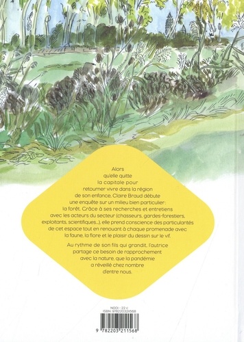 Alors qu'elle quitte la capitale pour retourner vivre dans la région de son enfance, l'autrice débute une enquête sur un milieu bien particulier, la forêt. Au fil des recherches et entretiens avec les acteurs économiques et sociaux du secteur (chasseurs, gardes forestiers, exploitants, scientifiques...), elle prend conscience que la réalité est assez éloignée de l'image d'Epinal qu'on en a souvent en tant que citadin. Ses pérégrinations en forêt sont autant d'occasions de se reconnecter à la nature, la faune, la flore et de pratiquer le dessin sur le vif, l'affut, l'aquarelle. Elle fera également la connaissance d'autres habitants des lisières de nos villes, les gitans. Au rythme des saisons et de son fils qui grandit peu à peu, Claire Braud partage sa quête d'un rapprochement avec "mère nature", que la pandémie actuelle a réveillé chez nombre de nos concitoyens. Entre enquête et introspection.